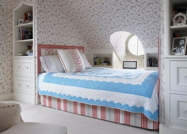 Lựa chọn những sọc màu xanh, trắng và chăn phụ họa tiết hình học đỏ sẽ giúp đánh lừa thị giác về không gian. Tuy phòng nhỏ nhưng vẫn đủ để kê thêm chiếc tủ xinh xắn lưu trữ các đồ dùng cần thiết. Bạn cũng có thể trang trí thêm một số bức tranh ở trên tường để không gian trở nên đỡ nhàm chán.