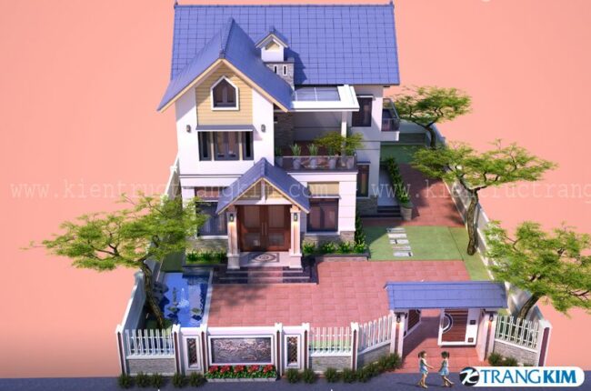 Mẫu biệt thự của anh Thanh – Hải Dương có kích thước 13x22m với không gian mặt trước và mặt sau thoáng. Trang Kim đã định vị công trình lùi về phía sau hết đất để lấy khoảng trước mặt được rộng nhất có thể. Hai bên sườn nhà mỗi bên bớt lại hơn một mét tạo lối đi quanh nhà và để mở cửa sổ lấy sáng và thông gió cho các phòng chức năng. Từ bậc đầu tiên của tam cấp ra đến cổng tường rào ngoài đường trước nhà còn lại 8m được thiết kế làm sân chơi kết hợp cây xanh, tiểu cảnh nước tạo nên điểm nhấn cho kiến trúc và phong thủy nhà biệt thự hiện đại.