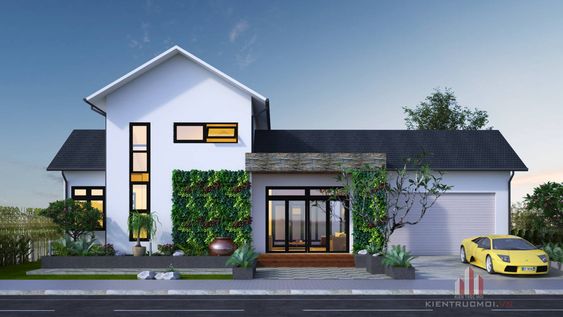 Với 2 tầng nhà hiện đại cùng với thiết kế mái thái độc đáo. Bố trí không thể hợp lý hơn giúp gia đình có thể tận hưởng cuộc sống tiện nghi tối đa. Một gara ô tô và lối đi nhỏ cho xe máy được bố trí riêng biệt nhau mang đến sự tiện lợi khi sinh hoạt. Màu sơn sáng trắng kết hợp với vàng đậm cùng mảng màu đặc trưng của đá mang lại nét đẹp rất tự nhiên, khỏe khoắn.