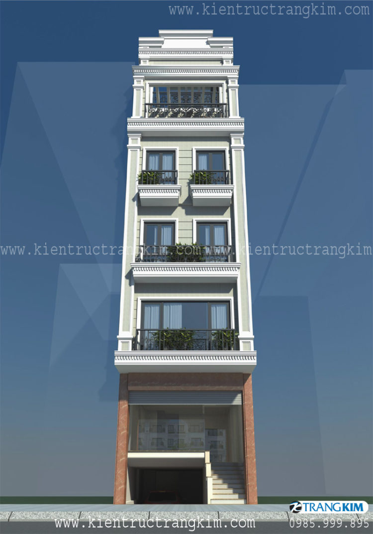 Tiếp theo là mẫu thiết kế nhà ống 5 tầngkết hợp sinh hoạt gia đình và cho thuê. Với diện tích đất xây dựng chỉ 50 m2 Chị Dung chủ ngôi nhà vừa muốn xây một công trình phía trên để ở và phía dưới làm văn phòng cho thuê. Vì được thiết kế làm văn phòng cho thuê nữa nên một tầng hầm cũng được thiết kế để giải quyết vấn đề để xe của tòa nhà. Bố trí cầu thang máy phía trong cùng cho việc di chuyển lên các tầng được thuận tiện hơn.