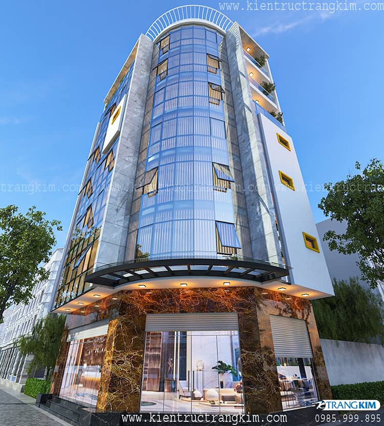 Nằm ở vị trí trung tâm, có một mặt tiền đẹp cùng thiết kế hiện đại, mẫu thiết kế chắc chắn sẽ thu hút những doanh nghiệp đang muốn thuê văn phòng làm việc. Các khối kiến trúc phía dưới và phía trên có tỉ lệ kiến trúc hợp lý mang đến tổng thể vững chắc, khỏe khoắn. Cửa kính màu xanh giúp văn phòng bên trong luôn có sự dịu mát, giảm tác động của bức xạ mặt trời.