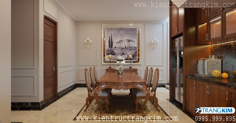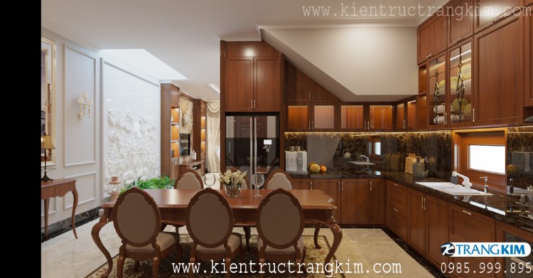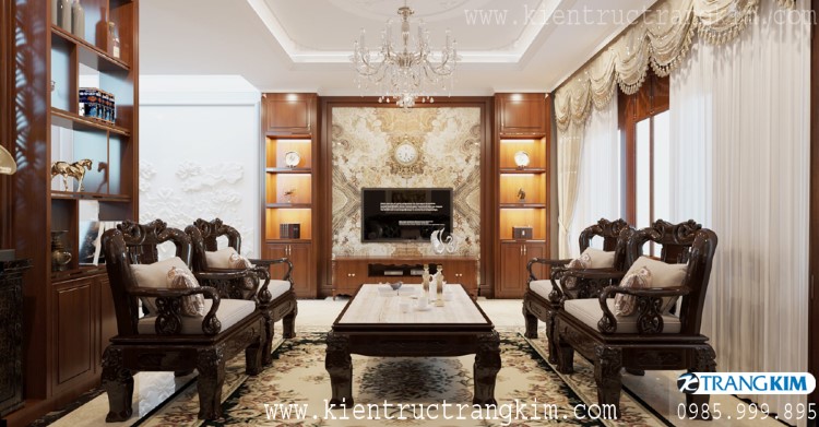 Bạn có thể sử dụng sofa bọc da, bàn ăn gỗ chạm khắc tinh xảo và các chi tiết trang trí cầu kỳ