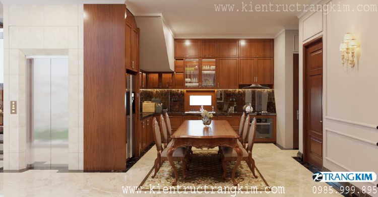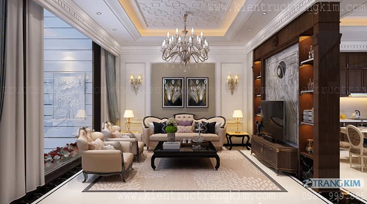Phong cách cổ điển đa phần sẽ sử dụng những gam màu trầm, ấm áp, họa tiết hoa văn cầu kỳ thể hiện được nét sang trọng và đẳng cấp. Vật liệu thường dùng khi thiết phòng khách liền bếp phong cách cổ điển, tân cổ điển là gỗ, đá, trạm khắc cả kim loại, vật liệu quý. Phong cách này tạo cho phòng khách nét đẹp sang trọng quý phái, thể hiện được sự bề thế, khẳng định được vị thế của gia chủ.