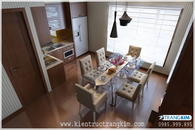 Một gợi ý nhỏ từ Trang Kim là bạn có thể sử dụng sofa đơn giản, bàn ăn gỗ và các thiết bị bếp hiện đại để tạo sự tiện nghi, ấn tượng cho phòng khách và bếp.