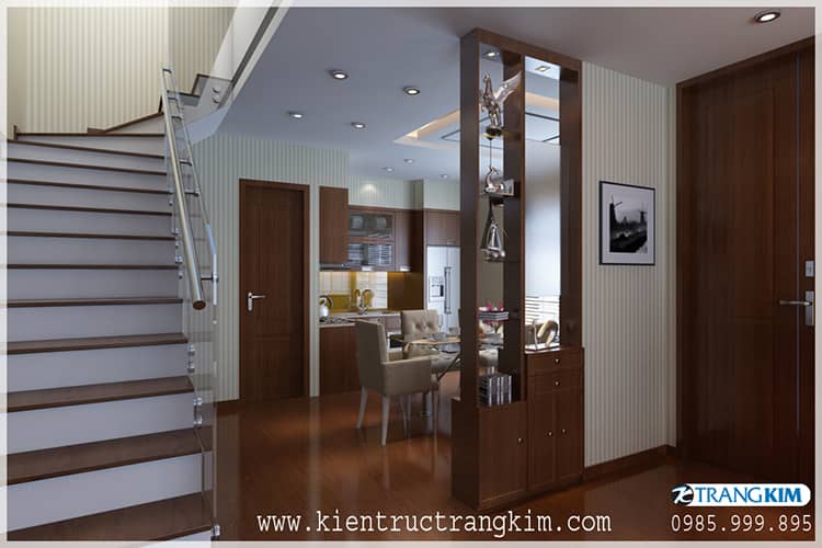 Cầu thang cũng là một yếu tố có thể sử dụng để ngăn cách không gian phòng khách và bếp. Cách này giúp tiết kiệm không gian nhà ống với đặc thù diện tích bé đồng thời cũng vẫn đảm bảo được công năng của cầu thang là để di chuyển lên tầng trên. Đây là cách phân chia phòng khách liền bếp phổ biến nhất cho không gian nhà ống những năm gần đây.