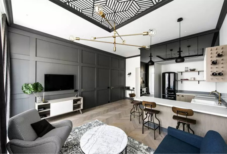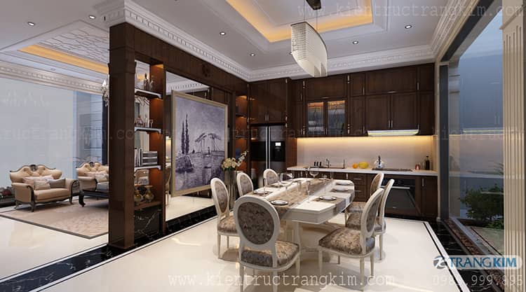 Tham khảo những mẫu thiết kế phòng khách liền bếp nhà ống phong cách cổ điển dưới đây:
