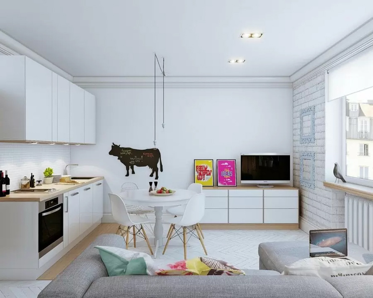 Một số hình ảnh phòng khách liền bếp phong cách Scadinavian như sau: