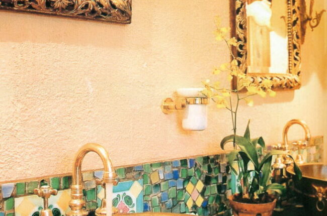 Tông màu được các KTS tư vấn lựa chọn là những gam màu trầm tạo được sự đầm ấm cho toàn bộ không gian phòng khách , xen kẽ vào đó là màu trắng sữa, đỏ sậm, vàng tạo nét hài hoà cân bằng về thị giác. Các mảng tưởng ở phòng khách sử dụng nhiều chất liệu và màu sắc khác nhau nhưng không gây rối mắt bởi hầu hết những gam màu này đều có tính dịu nhẹ, lịch lãm. Cụ thể, mảng tường phía sau ti vi dùng gỗ sơn màu nâu kết hợp treo tranh trang trí mang lại vẻ đẹp sang trọng cho ngôi nhà; mảng tường sau ghế sofa kết hợp hài hoà giữa hai tông màu trắng sữa của sơn tường và màu nâu của gỗ nhằm tạo sự hài hoà về màu sắc; mảng tường bên cạnh sử dụng gạch ốp đem lại vẻ đẹp mộc mạc, gần gũi cho ngôi nhà.