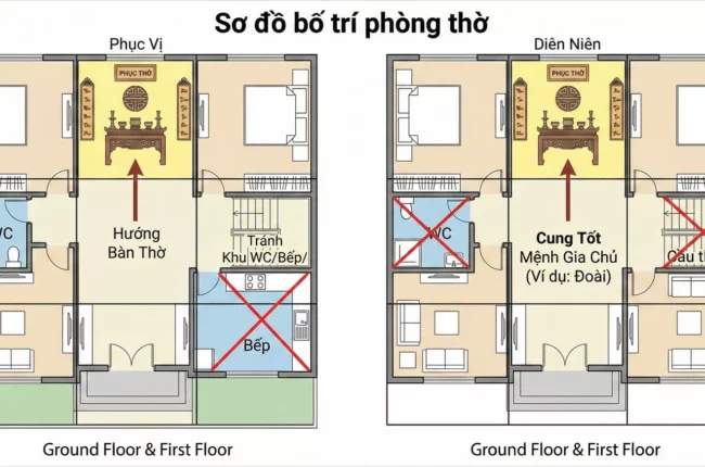 Khi bố trí các không gian quan trọng (phòng làm việc, phòng thờ), nên ưu tiên xét cung Càn của toàn nhà trước, sau đó mới cân nhắc đến từng tầng.
