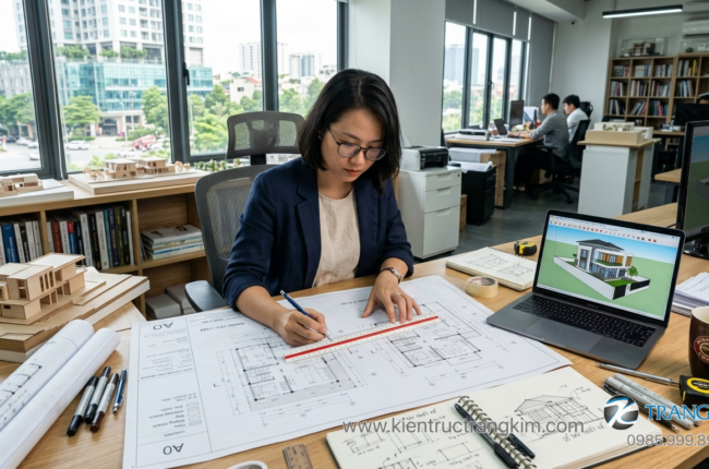 Đội ngũ kiến trúc sư của Trang Kim sẽ hỗ trợ tư vấn giải pháp thiết kế, dự toán chi phí và phương án thi công phù hợp với nhu cầu của từng gia đình.