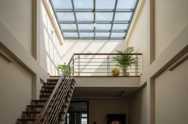 Trong các khu nhà trọ diện tích hạn chế, việc kết hợp giếng trời với cầu thang là giải pháp rất thông minh. Cách làm này:
