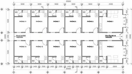Với khu đất hạn chế về diện tích, mẫu nhà trọ 1 trệt 1 lầu giúp bố trí đủ 10 phòng mà vẫn đảm bảo công năng. Mẫu này thường có: