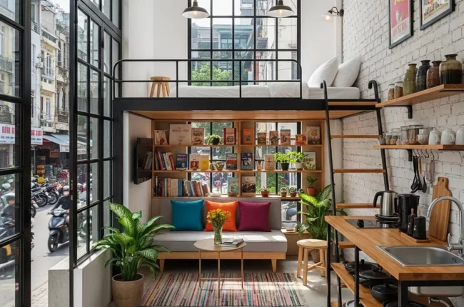 👉 Tầng dưới dành cho sinh hoạt ban ngày, gác lửng dành cho nghỉ ngơi.