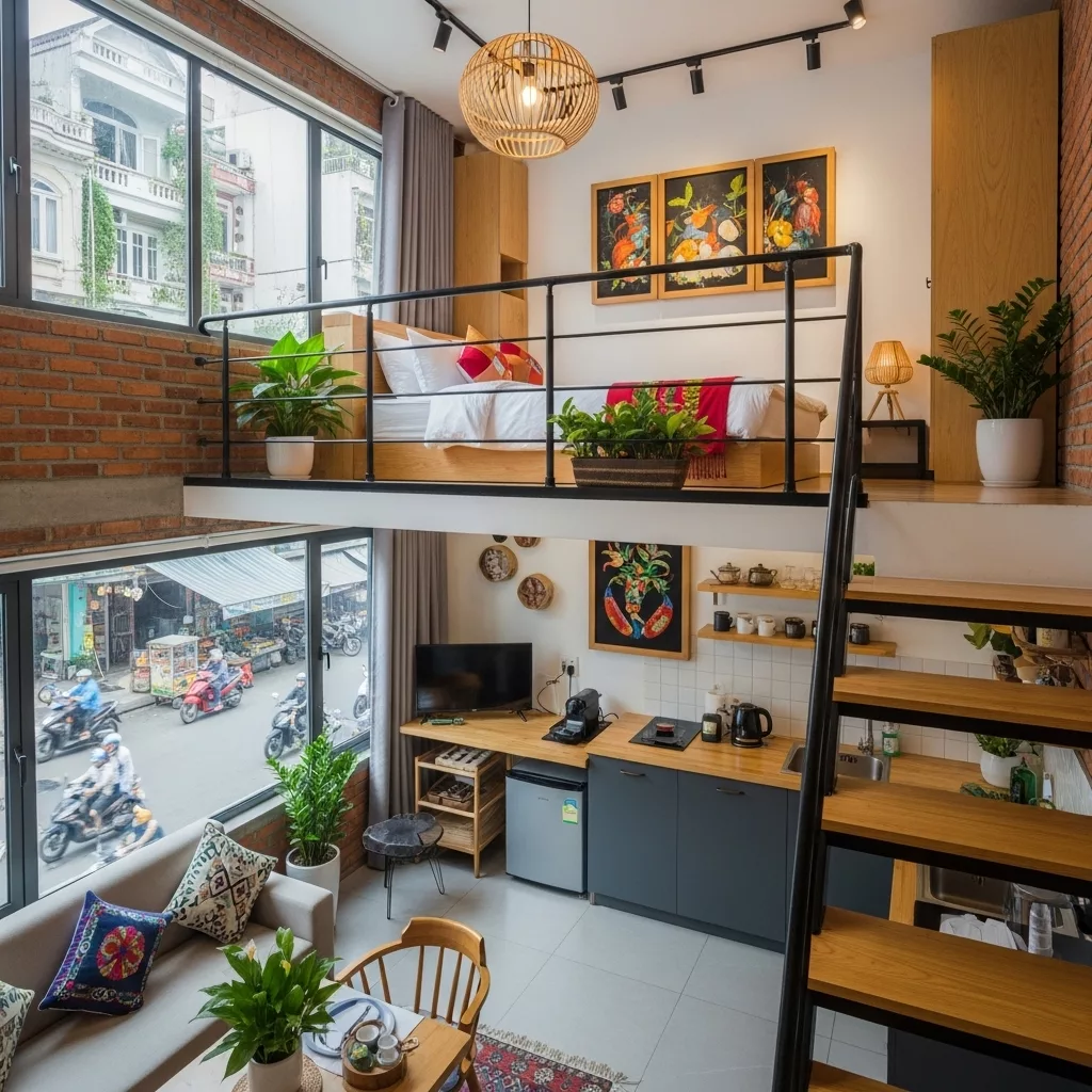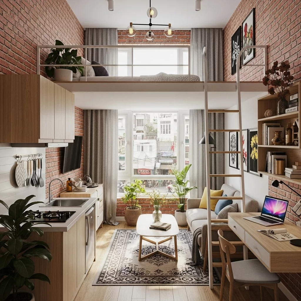 Với cùng một mặt bằng, phòng trọ có gác lửng luôn tạo cảm giác rộng hơn phòng trọ không gác. Điều này đặc biệt hiệu quả khi kết hợp với: