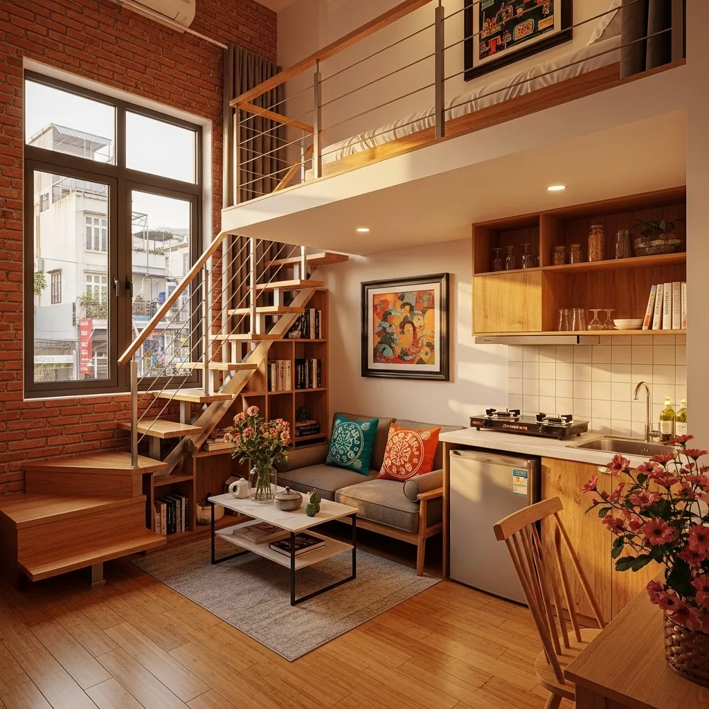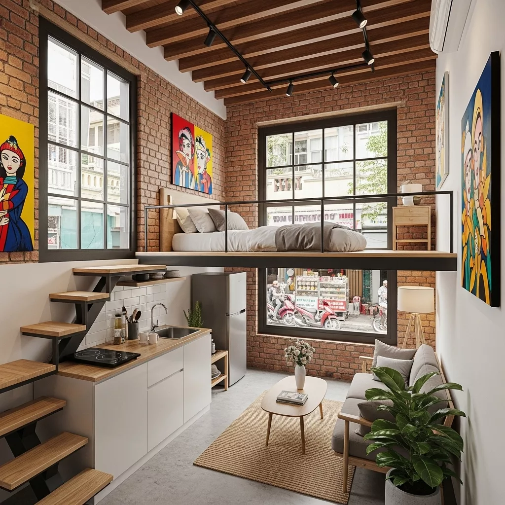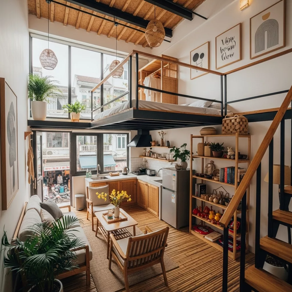 👉 Tầng dưới dành cho sinh hoạt ban ngày, gác lửng dành cho nghỉ ngơi.