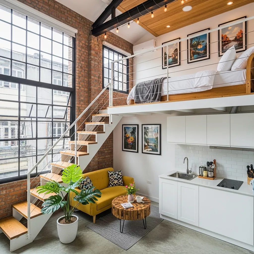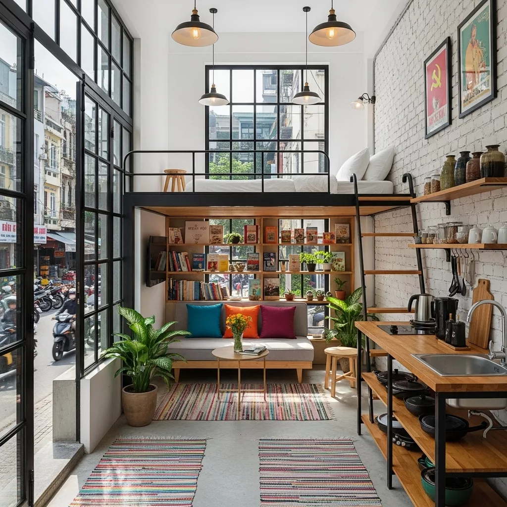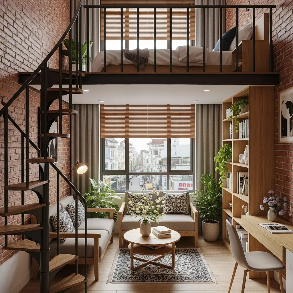 👉 Tầng dưới dành cho sinh hoạt ban ngày, gác lửng dành cho nghỉ ngơi.