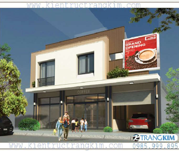 Còn mẫu nhà kết hợp kinh doanh thì sao? Thiết kế được tận dụng khoảng diện tích tầng 1 cho quán cà phê thuê. Với mặt tiền tận 12m mang lại lợi thế cần thiết cho việc kinh doanh thuận lợi. Tầng 2 là khu vực phòng ngủ gia đình, nơi tách biệt hoàn toàn với tầng 1 cà phê bên dưới. Lối đi lên cũng bố trí tại một gara bên phải quán cà phê. Thật tiện lợi đúng không bạn?